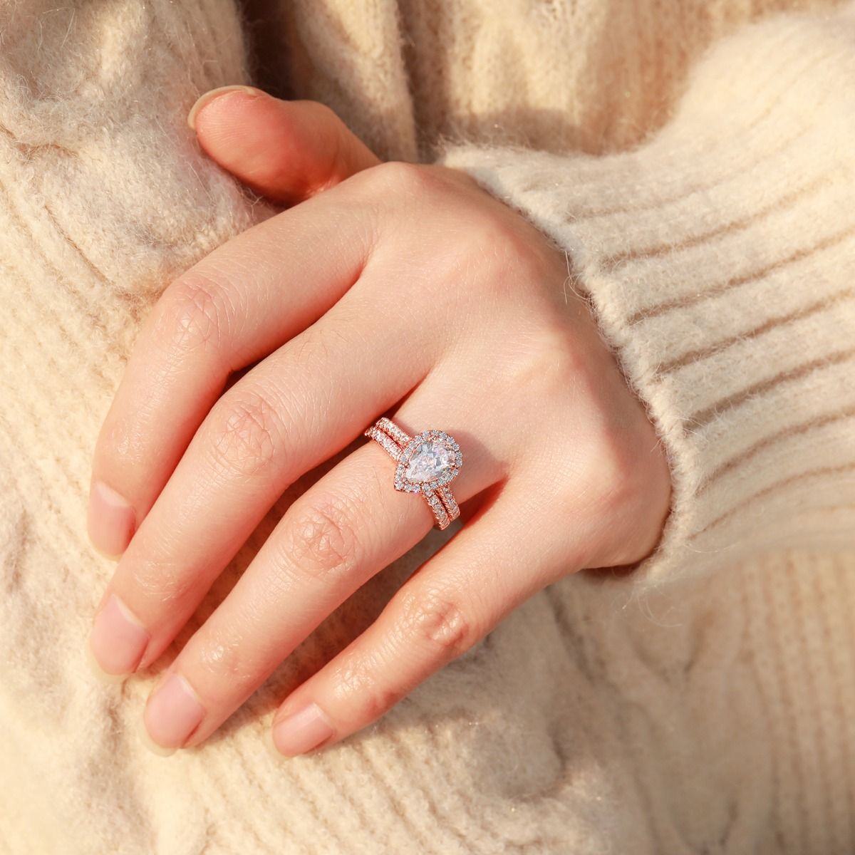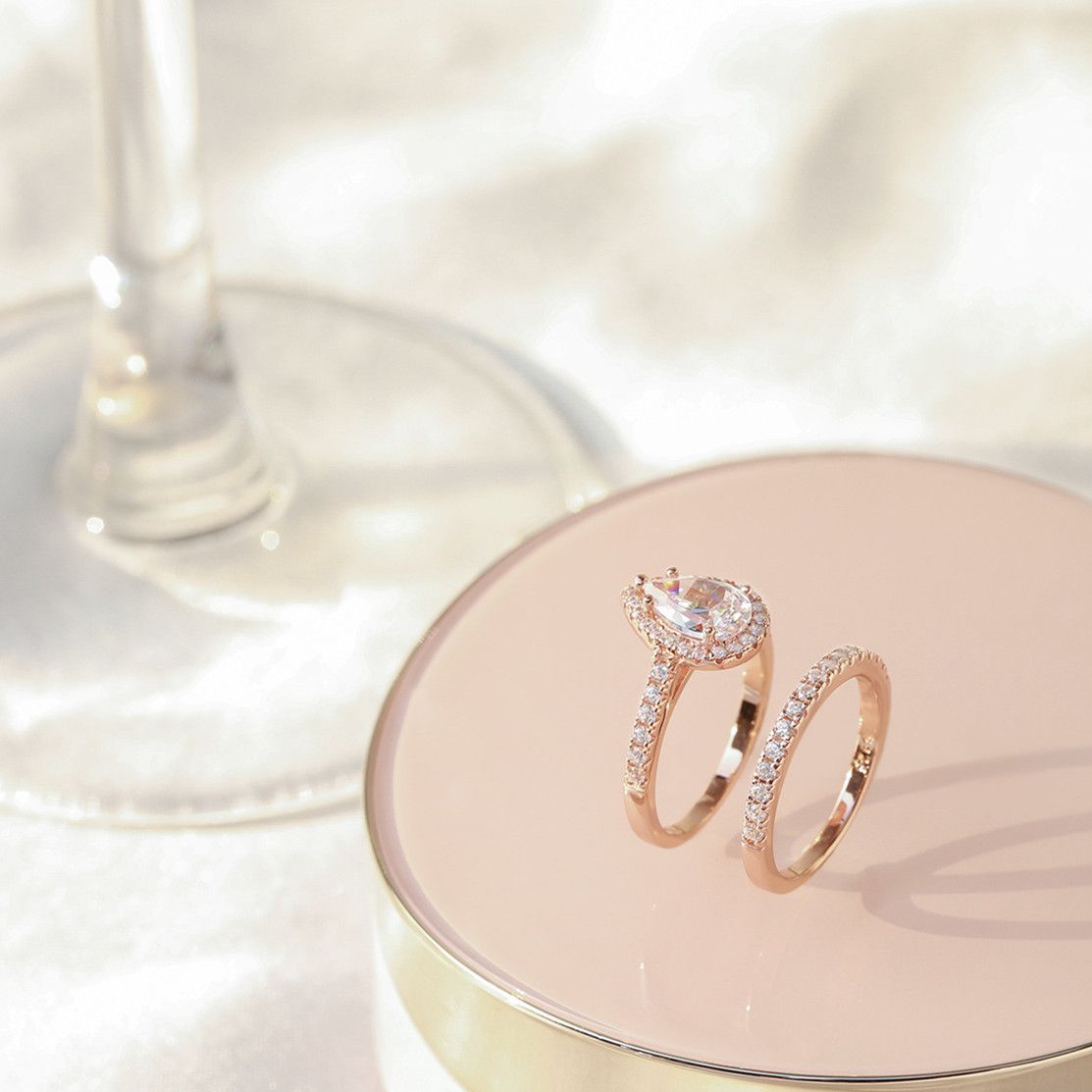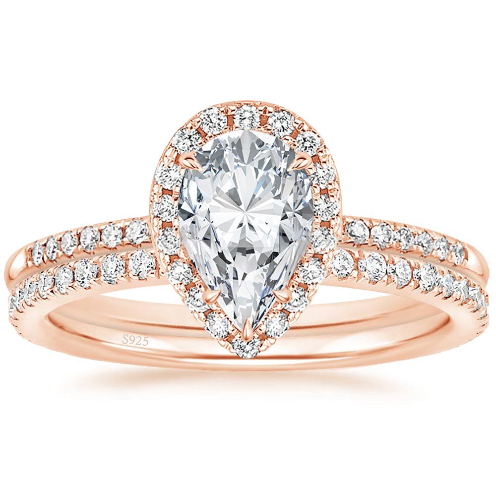 Shop our wholesale collection of beautiful rose gold 925 sterling silver teardrop bridal rings sets featuring cubic zirconia. These stunning engagement rings are perfect for women looking for a romantic and elegant touch to their special day. Each ring is made with high-quality 925 sterling silver and crafted to last a lifetime.